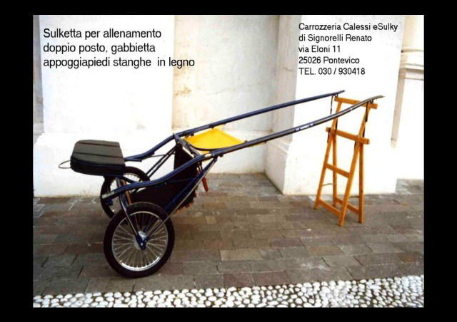 Sulketta da lavoro per trottatori o per domapuledri sedile a 1 o 2 posti disponibile con cesto appoggiapiedi teline parasabbia stanghe in metallo o in legno regolabili in altezza personalizzabili con colori di scuderia e nome